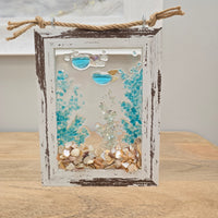 - Beautifully sorted shells, glass, and sand applied with resin to a glass canvas. Showcase these beautiful pieces on a wall, in front of a window, or even a plate stand.