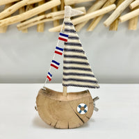 - These handmade sailboats are coastal inspired and adorable! From the wooden base, nautical inspired fabrics, anchors, rudders, and even a life preserver, these sail boats are a must have.