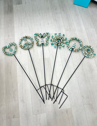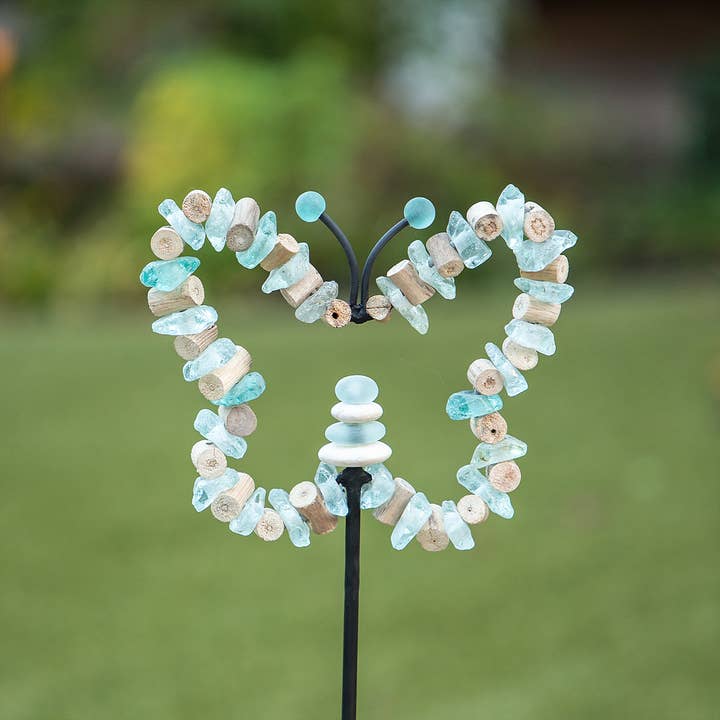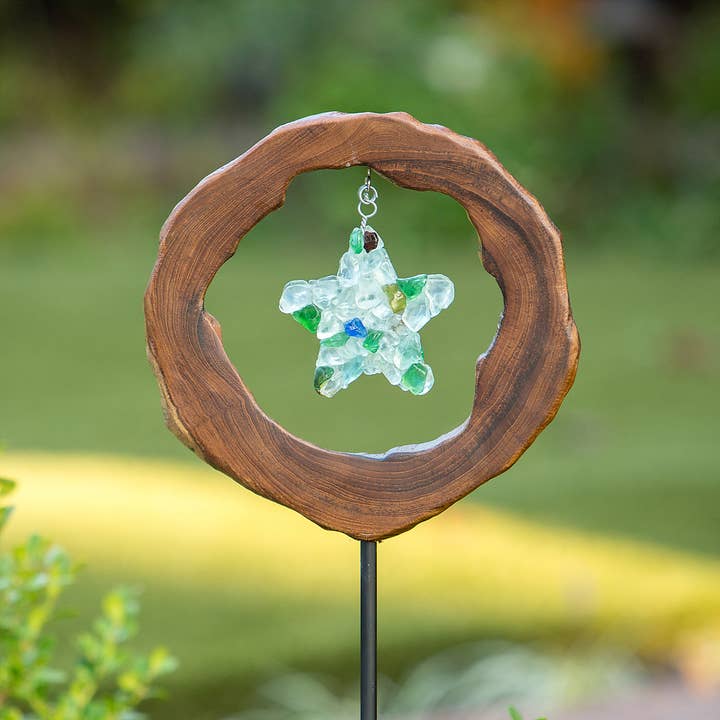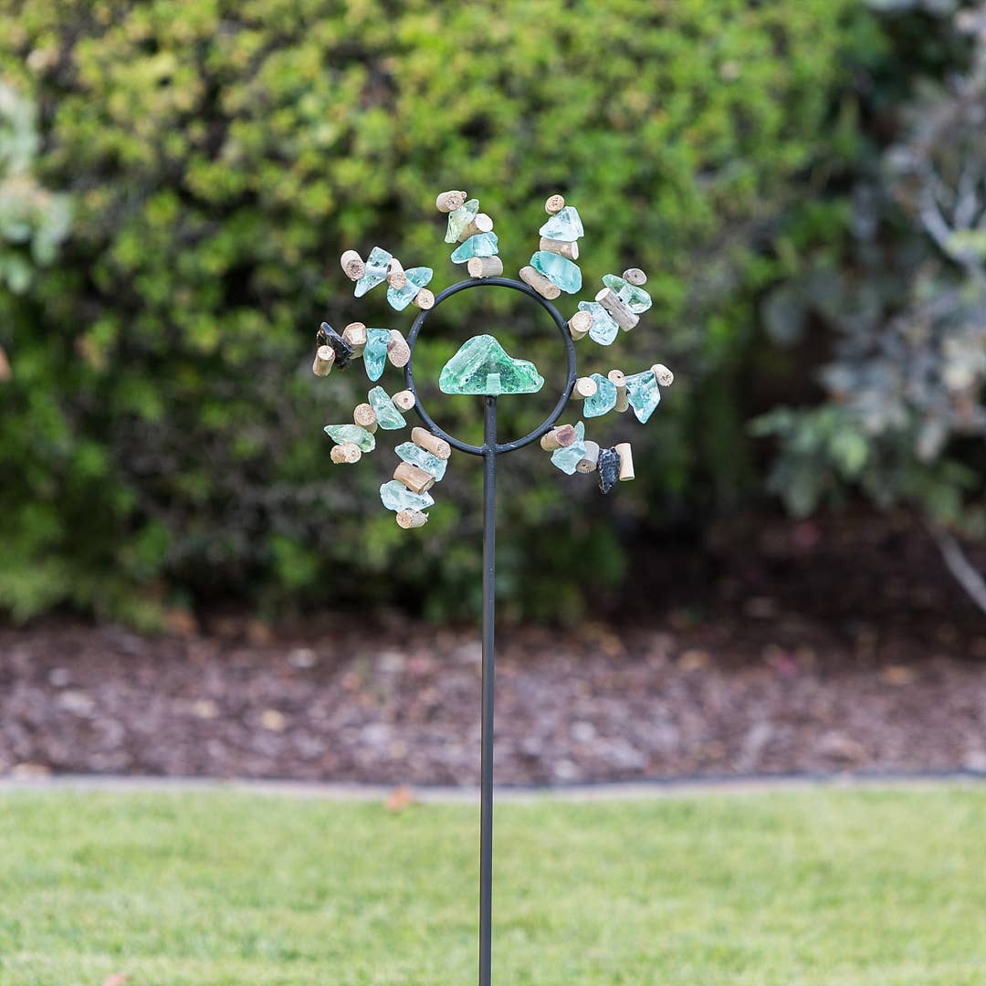 - These gorgeous Glass, Driftwood, & Stone Stakes are made of glass, rock, and driftwood and are the perfect touch to any garden, backyard, or patio area. The rod base is made to stake in your bed or large planter to perfectly catch the sparkle of the sun's rays in the teal colored glass.