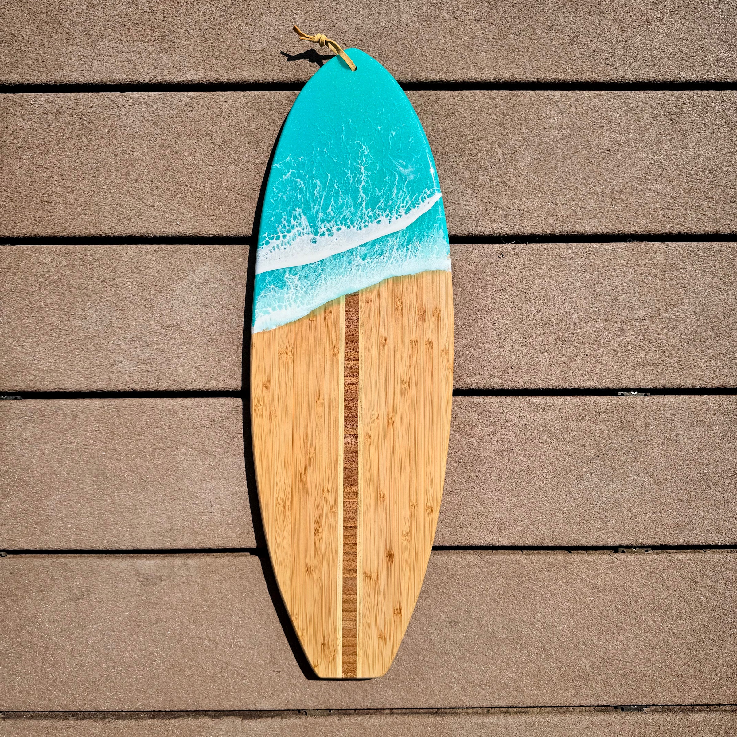 - Step up your charcuterie board game with our beach inspired resin charcuterie boards! Made with the love of the ocean in mind, this bamboo surfboard charcuterie board brings the ocean right to your table with its beautiful teal colors and cresting white waves.