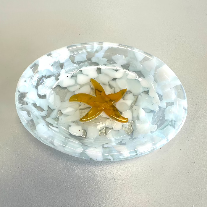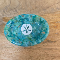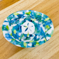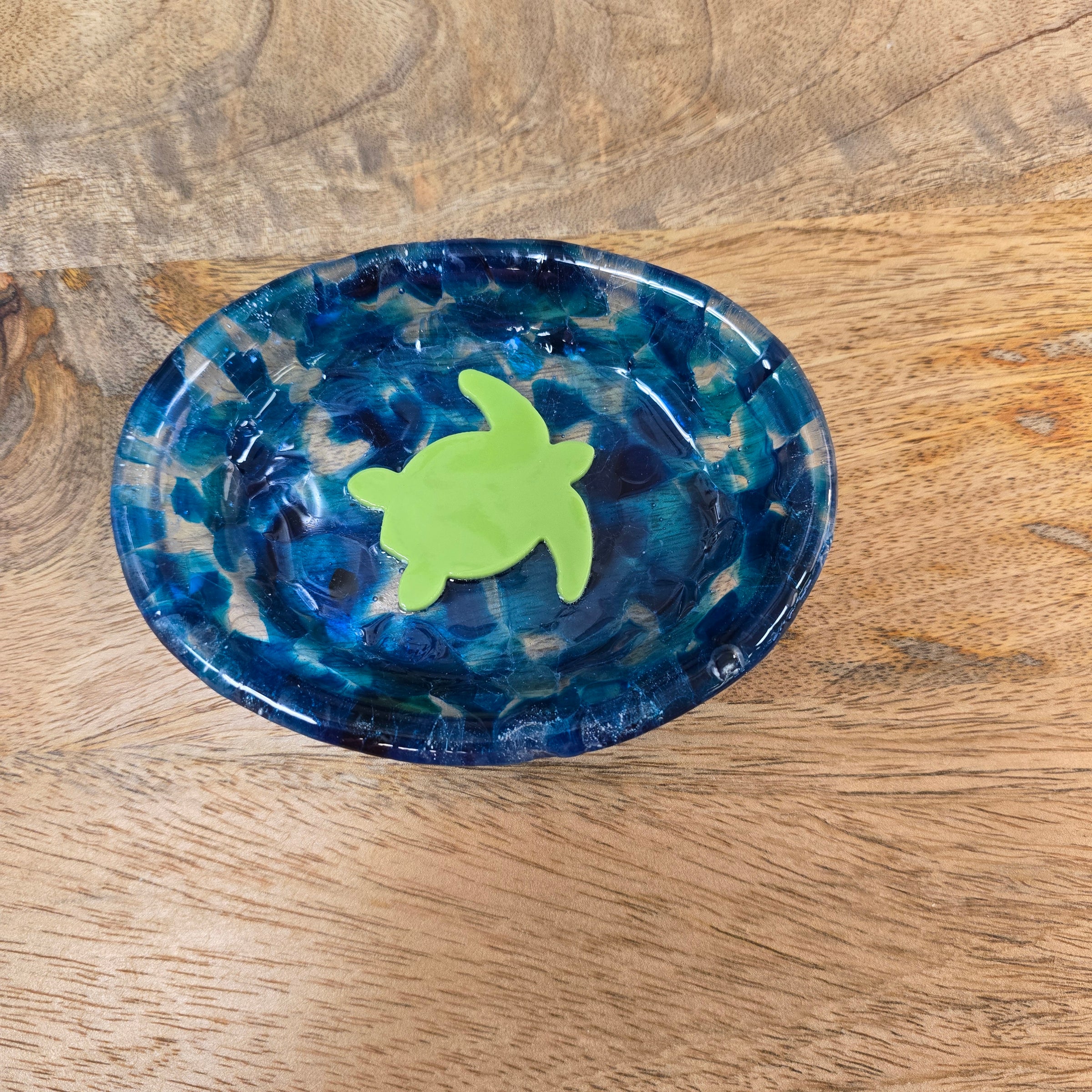 - Show your love of the ocean with this beautiful, handmade, glass soap dish with a sea turtle. The artist has taken dozens of pieces of glass to form the piece you see with all its beautiful colors and intricate details.