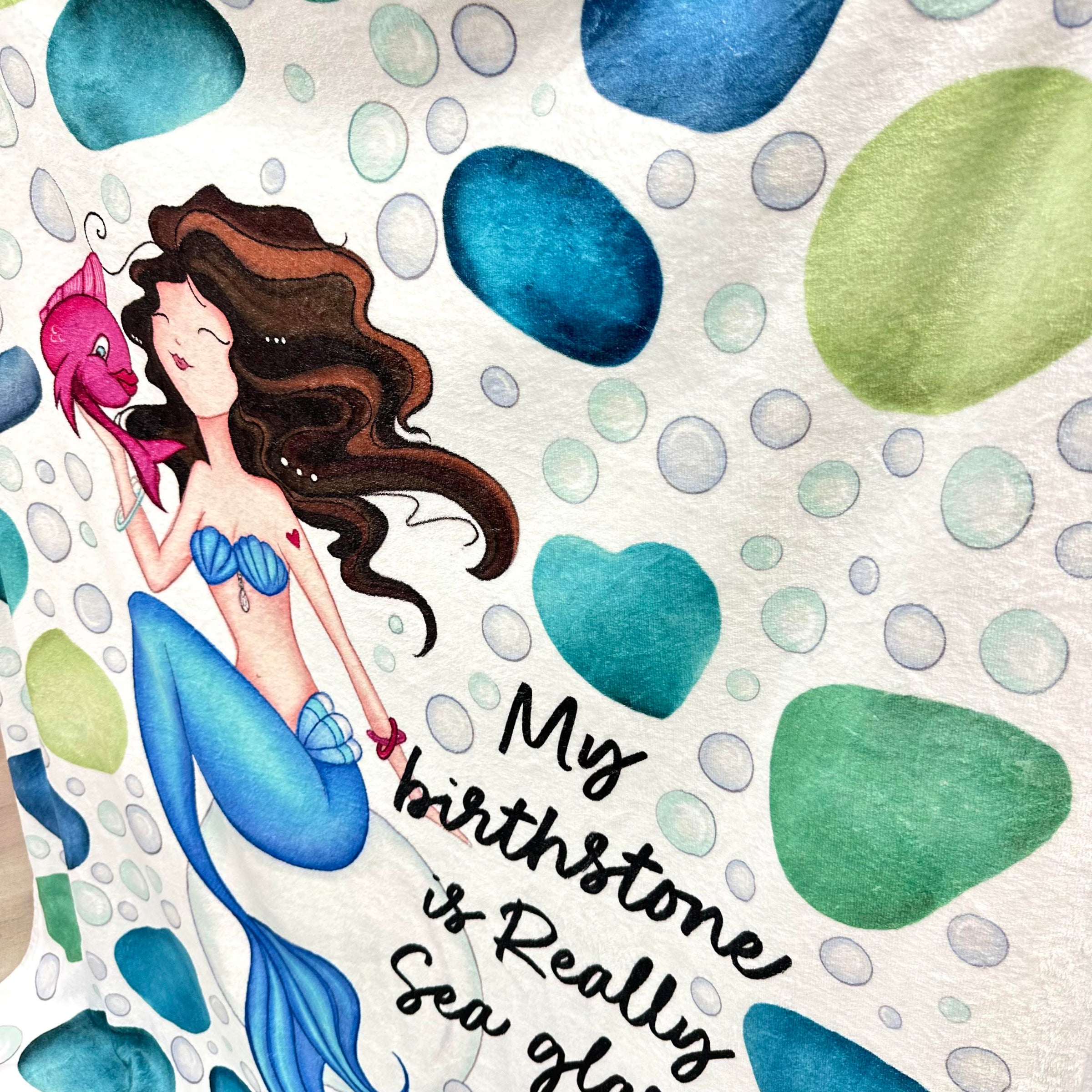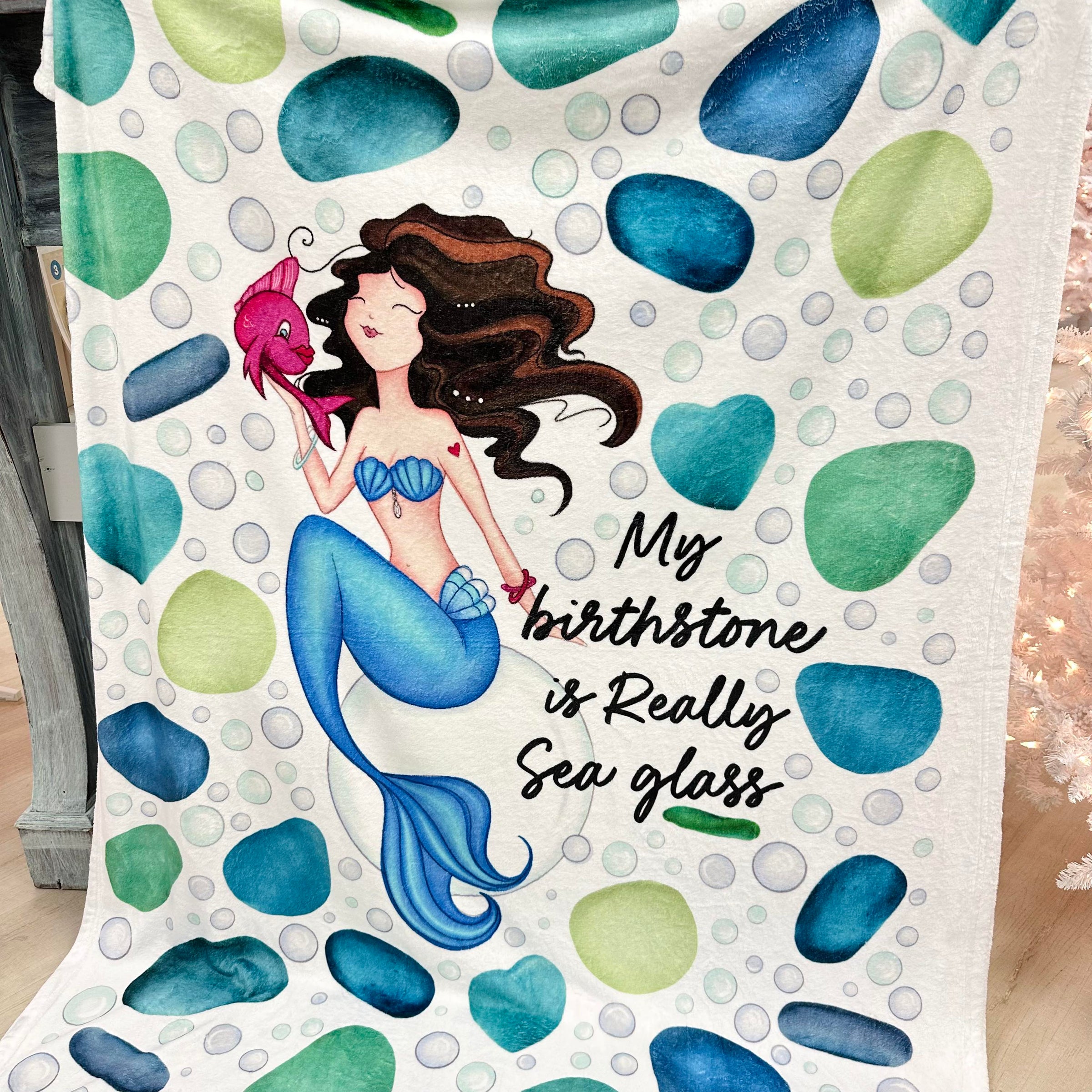 Say hello to your new favorite blanket with our My Birthstone Is Really Sea Glass Velveteen Minky Blanket! The incredibly soft and comfortable fabric has a lovely mermaid with her pink fish friend surrounded by pieces of sea glass. Perfect for lounging at home, on the beach, or anywhere your heart desires!