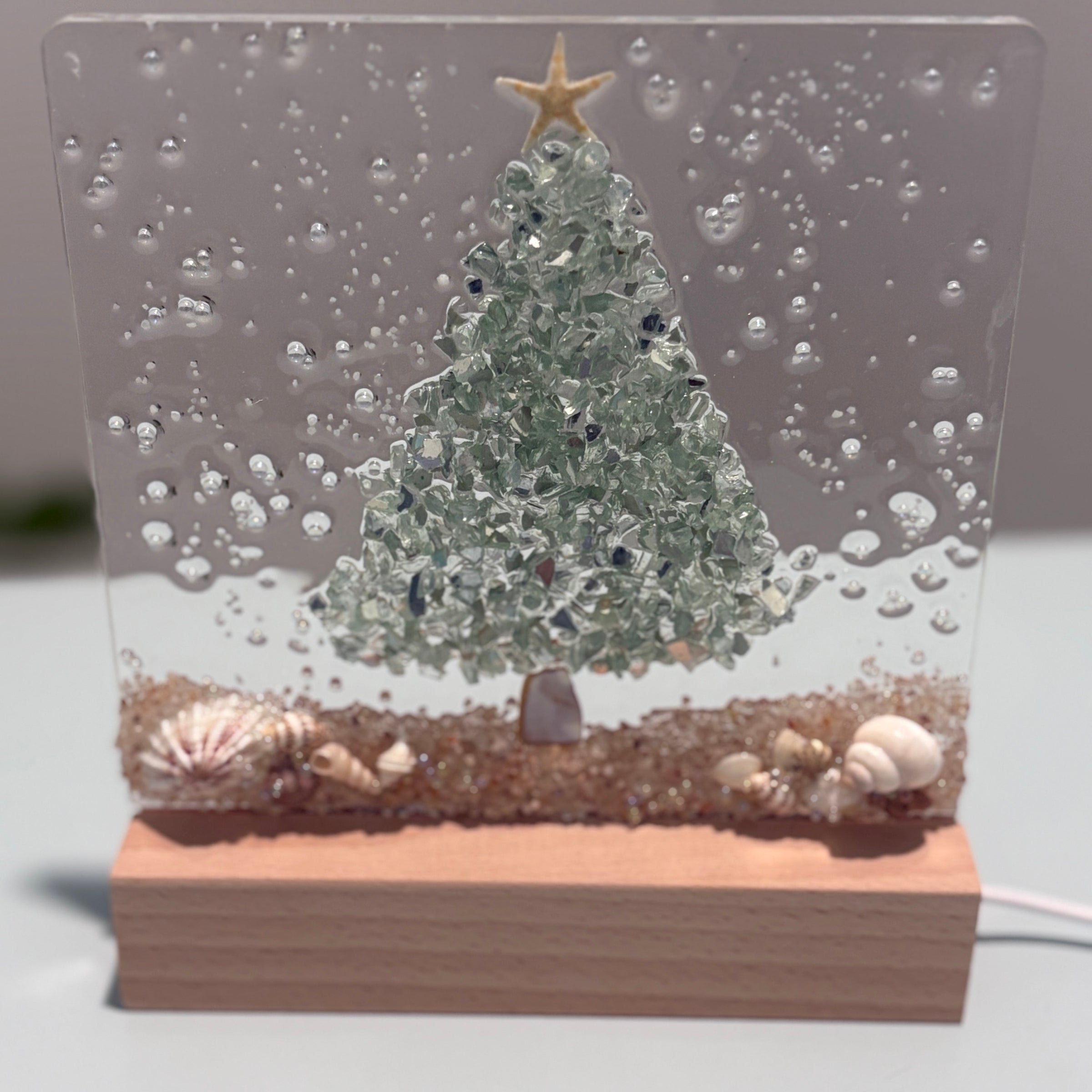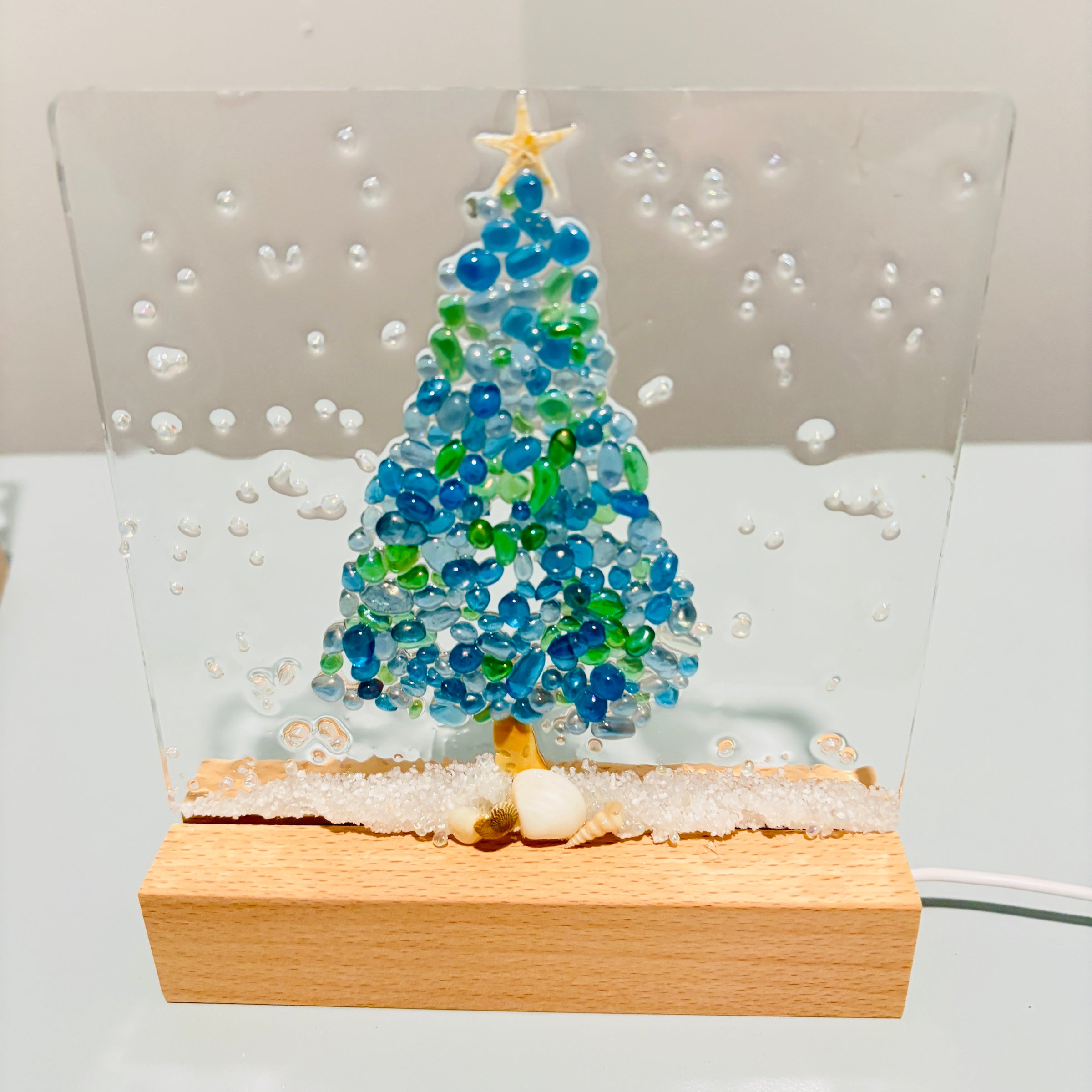 Acrylic LED Lights w/ Coastal Christmas Tree Designs in Glass, Sand, Shells Resin