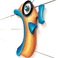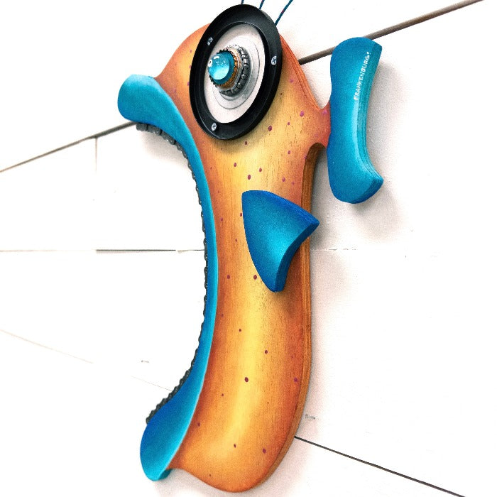 - Add some pop to your space with this beautiful Funky Wooden fish! Featuring vibrant orango skin and blue fins, plus metallic teeth for an extra touch of shimmer, this unique piece is perfect for brightening up your wall!